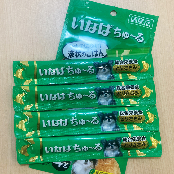 スティック状の小袋にはいっているので、開けたての美味しさを都度味わえるのはもちろん、ワンちゃんがそのまま舐めて食べる事ができます。この形状のおかげで、飼い主さんは、今までお皿にうつむいていたワンちゃんの食べている様子を目の前で見られるようになりました。ワンちゃんが夢中においしそうに食べるかわいい姿に、飼い主さんも夢中です。(袋を噛んで飲み込まないようにご注意ください。)